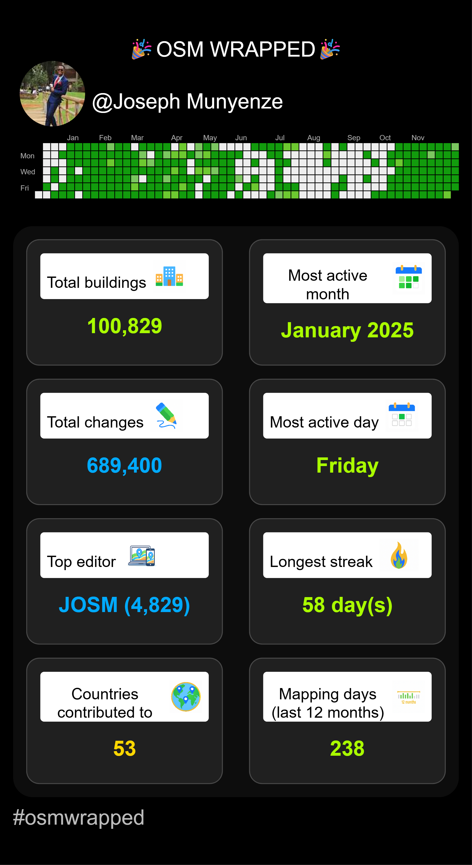 Using React, the interface is designed to be responsive and data-driven highlighting each user’s journey in mapping. Enter your OSM username to generate a personalized summary including mapping streaks, most active month, countries contributed to, and other achievements📊.